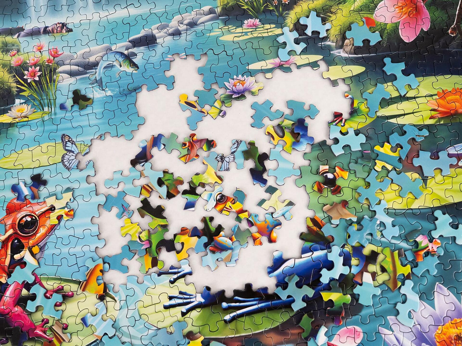 - Lose yourself in the lush serenity of Lily Pond Paradise, a 1000-piece jigsaw puzzle bursting with life and color. Set in a dreamy jungle oasis, vibrant frogs lounge on lily pads while butterflies and dragonflies flutter above shimmering waters. Framed by cherry blossoms, lotuses, and a cascading waterfall, this enchanting puzzle is a peaceful escape into nature's most whimsical beauty.