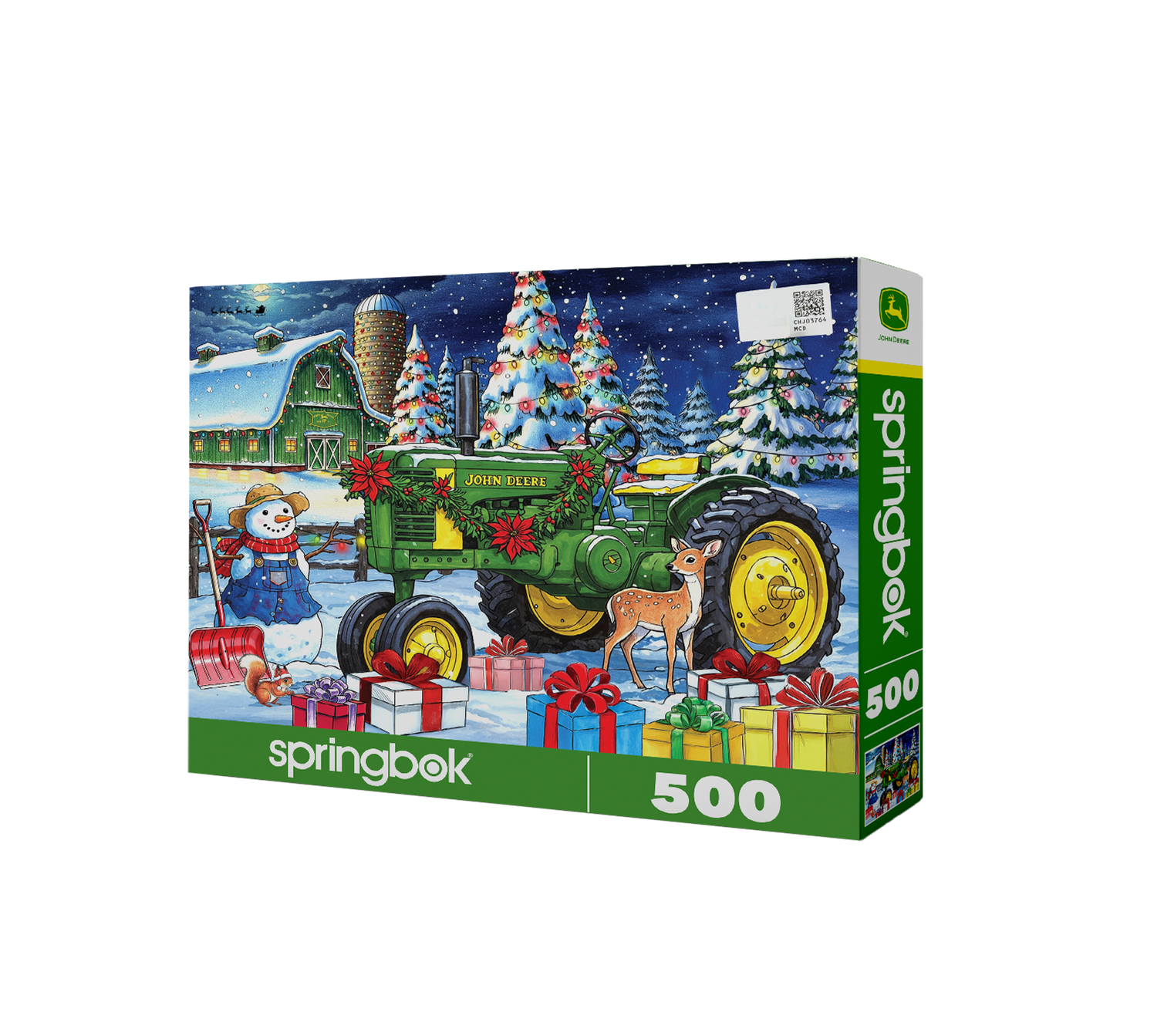 Celebrate the holidays country-style with the John Deere “Festive Farm Surprise” 500 Piece Jigsaw Puzzle. This cheerful winter scene features a classic green John Deere tractor decorated with poinsettias and garland, surrounded by gifts, a friendly snowman, and woodland animals. With 500 precision-cut pieces, this puzzle offers a joyful challenge for families and collectors alike. Perfect for cozy winter nights and a must-have for every John Deere fan.