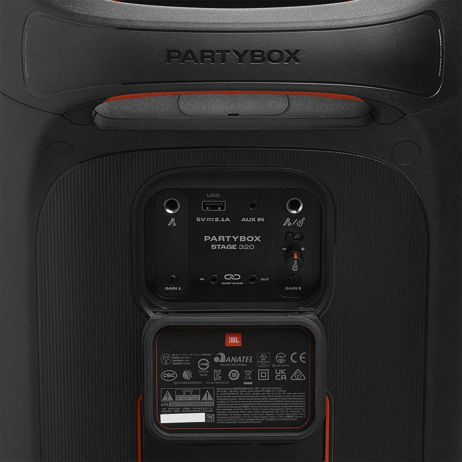 JBL PartyBox Stage 320 - Portable Party Speaker with Telescopic Handle & Wide, Sturdy Wheels, Powerful JBL Pro Sound, Futuristic lightshow, Up to 18 Hours of Play time, Splash Proof (Black) Item#: JBLPBSTAGE320AM Description Bring your party anywhere With the JBL PartyBox Stage 320, you can get the party started anytime, anywhere. Transform any space, inside or outdoors, into a dance floor. Powerful JBL Pro Sound and big thumping bass fill a wide soundstage and get the crowd moving, while their eyes are delighted by an adaptive lightshow of swirling starry lights, cool light trails, and amazing strobe effects synced to your beat. Use the mic and guitar inputs to show off your stage presence. You can steer the party's flow throughout the night with fun interactive party effects. The solid telescopic handle and wide, sturdy wheels mean you can roll the JBL PartyBox Stage 320 just about anywhere, and once you're there, the splash-proof construction means a little rain won't ruin the fun. Best of all, it delivers up to 18 hours of playtime—and if the good times are still rolling, just swap out the replaceable battery and keep going. For an even bigger party, it's easy to connect or use the JBL PartyBox app to connect multiple JBL Auracast-enabled speakers wirelessly. Bring people together and elevate the experience with the JBL PartyBox Stage 320. Specs General Specifications Output power (W) 240 Audio Specifications Dynamic frequency response range (Hz) 40Hz - 20kHz (-6dB) Dimensions Dimensions (Width x Height x Depth) (cm) 33.5 x 67 x 38.5 Dimensions (Width x Height x Depth) (in) 13.3 x 26.3 x 15.2 Weight (kgs) 16.5 Weight (lbs) 36.38 Control and Connection Specifications Bluetooth version 5.4 Battery Charging time (hrs) 3 Maximum music playing time (hrs) 18 Features AC power cable (type varies by regions) Yes Splashproof Yes AI Sound Boost Yes Guitar-In Yes Mic-In Yes Karaoke function Yes 3.5 mm audio cable Input Yes Bluetooth Yes Dual Mic & Guitar inputs Yes Lightshow Yes Multi-point Connection Yes Supports Auracast Yes IP Code IPX4 What's in The Box? 1 x JBL PartyBox Stage 320 1 x Quick-start guide 1 x Safety Instruction and Warranty Card AC power cord - quantity and plug type vary by regions. FEATURES Powerful JBL Pro Sound: Two 6.5" woofers that deliver clean, precise, deep bass even at top volume and a pair of 25mm dome tweeters that produce crystal clear highs. Loud enough to fill a space the size of a tennis court with music. Futuristic lightshow: Take all that sound and add a thrilling lightshow featuring starry lights, cool light trails, and strobe light effects—all synced to your beat. Up to 18 hours of play time: Party from dusk till dawn with up to 18 hours on a single charge. Not enough? Swap out the replaceable battery and keep on dancing. 10 min fast charge gets you an extra 2 hours of playtime.Replaceable battery sold separately Telescopic handle and wide, sturdy wheels: Roll up to the party with wide, sturdy wheels and an easy-to-grip handle that telescopes up when you need it and down when you don't. Splash proof: Whether you're partying with friends in the park or by the seaside, the JBL PartyBox Stage 320 is IPX4 splashproof, means a little rain won't stop the fun. Dual Mic and Guitar Inputs: Bring live talent into the mix. It's easy to sing and play along using the guitar and dual mic inputs. With karaoke EQ tuning and the built-in lightshow, everybody's gonna sound—and look—like a superstar. Multi-speaker connection by Auracast: Want even more roaring Original JBL Pro Sound? Stereo pair two speakers for a wider sound stage. For your biggest events, multiple JBL Auracast-enabled PartyBoxes can be connected wirelessly using Auracast.