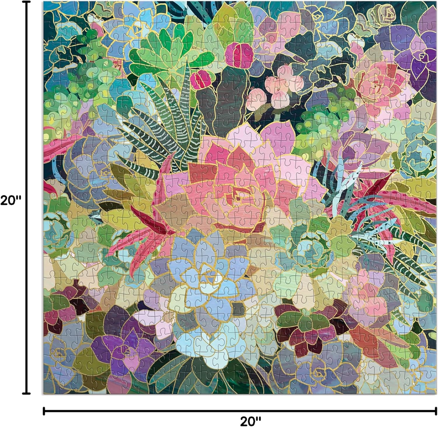 The Succulent Mosaic 500 Piece Foil Puzzle from Galison illustrates the multitude of color within the world of succulents, with the plants coming alive with shiny gold foil accents. Galison puzzles are packaged in matte-finish sturdy boxes, perfect for gifting, reuse, and storage.