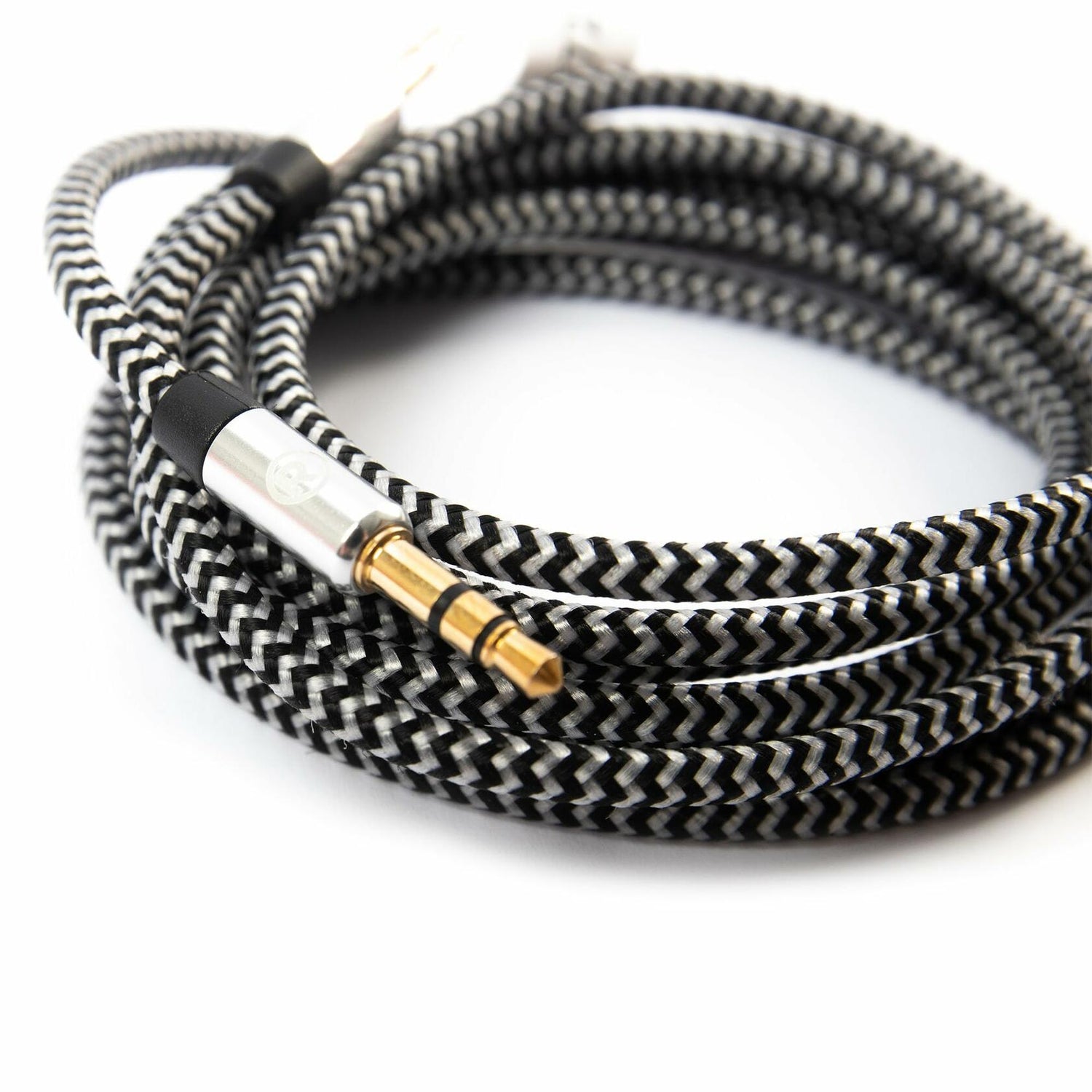 This 6-foot braided male-to-male 3.5mm audio cable in classic black and white with a sleek metal finish is designed to elevate your audio experience to the next level. Crafted with precision and engineered for durability, this cable ensures reliable connectivity and consistent sound quality for all your audio devices. With its 3.5mm jack, this 3.5mm to 3.5mm audio cable is universally compatible with a wide range of devices, including smartphones, tablets, laptops, MP3 players, and more. Whether you're listening to music, watching movies, or gaming, this aux to aux cable helps to deliver crisp, clear sound for an immersive audio experience. The braided design not only adds a touch of style but also enhances its durability and strength, and provides extra protection against wear and tear, and tangles and ties, thus ensuring long-lasting performance even with frequent use. The 6-foot length provides extra reach for flexible and convenient usage. Whether you're connecting your device to a speaker system, to the car stereo from the back seat, or to your headphones, this 3.5mm cable provides the perfect length for hassle-free connectivity in any environment. The black and white color scheme provides a modern splash of style, while the metal connectors ensure a secure and reliable connection. This 3.5mm male-to-male cable delivers exceptional sound quality wherever you are, with fewer tangles and with an extended useful life.