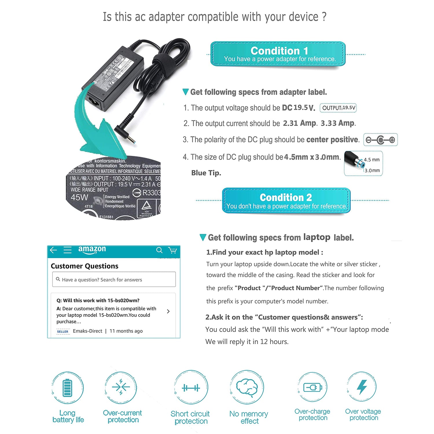 45W 65W Laptop Charger SK90A195231 for HP Pavilion 15-F:15-f111dx 15-f272wm 15-f211wm 15-f271wm 15-f233wm 15-f387wm 15-f211nr 15-f337wm 15-f224wm and More hp Laptop Power Supply Cargador Ac Adapter