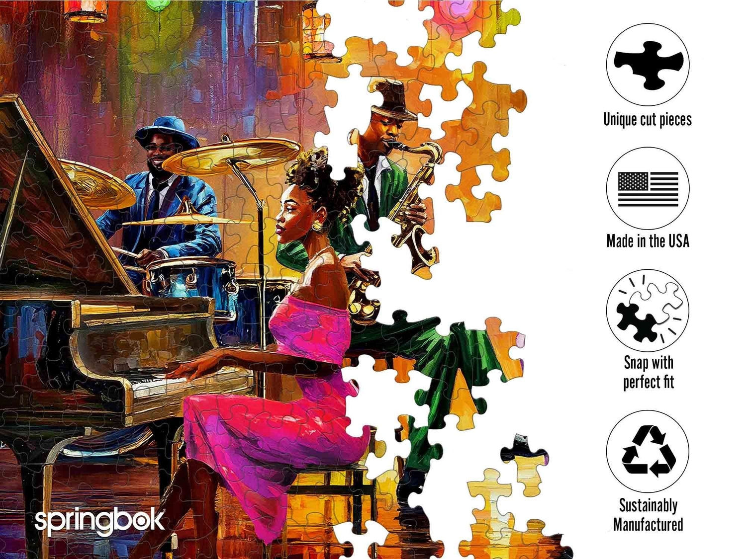 Feel the rhythm and soul in this lively puzzle featuring a jazz band in vibrant outfits performing under colorful lanterns. An energetic and musical design that's pure joy to piece together. Jigsaw puzzles are a brain-boosting pastime. Assembling the pieces enhances memory, problem-solving, and spatial reasoning. The activity fosters concentration, patience, and a sense of accomplishment. Regular puzzle-solving is linked to improved cognitive function and may reduce the risk of neurodegenerative diseases. Puzzling is not just a game it's a therapeutic workout for your mind. The process requires concentration and attention to detail, fostering improved focus and patience. In essence, the simple act of piecing together a jigsaw puzzle transcends leisure, becoming a therapeutic activity that nurtures the mind and promotes mental well-being.
