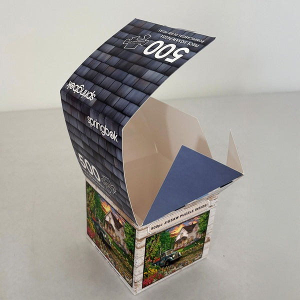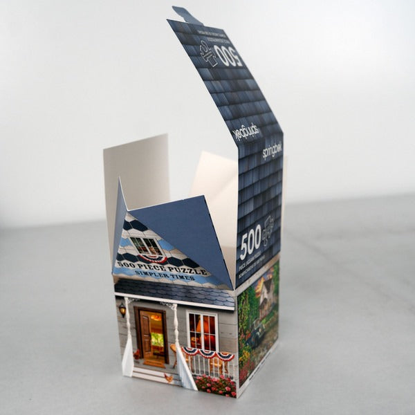 Slow down and savor the charm of Simpler Times. Nestled in a delightful, house-shaped box, this limited-edition puzzle invites you into a scene filled with warmth, nostalgia, and the comforts of home. From the gentle rhythm of everyday life to the welcoming glow of a small-town sunset, each piece captures the beauty of slowing down and appreciating life’s quiet moments.