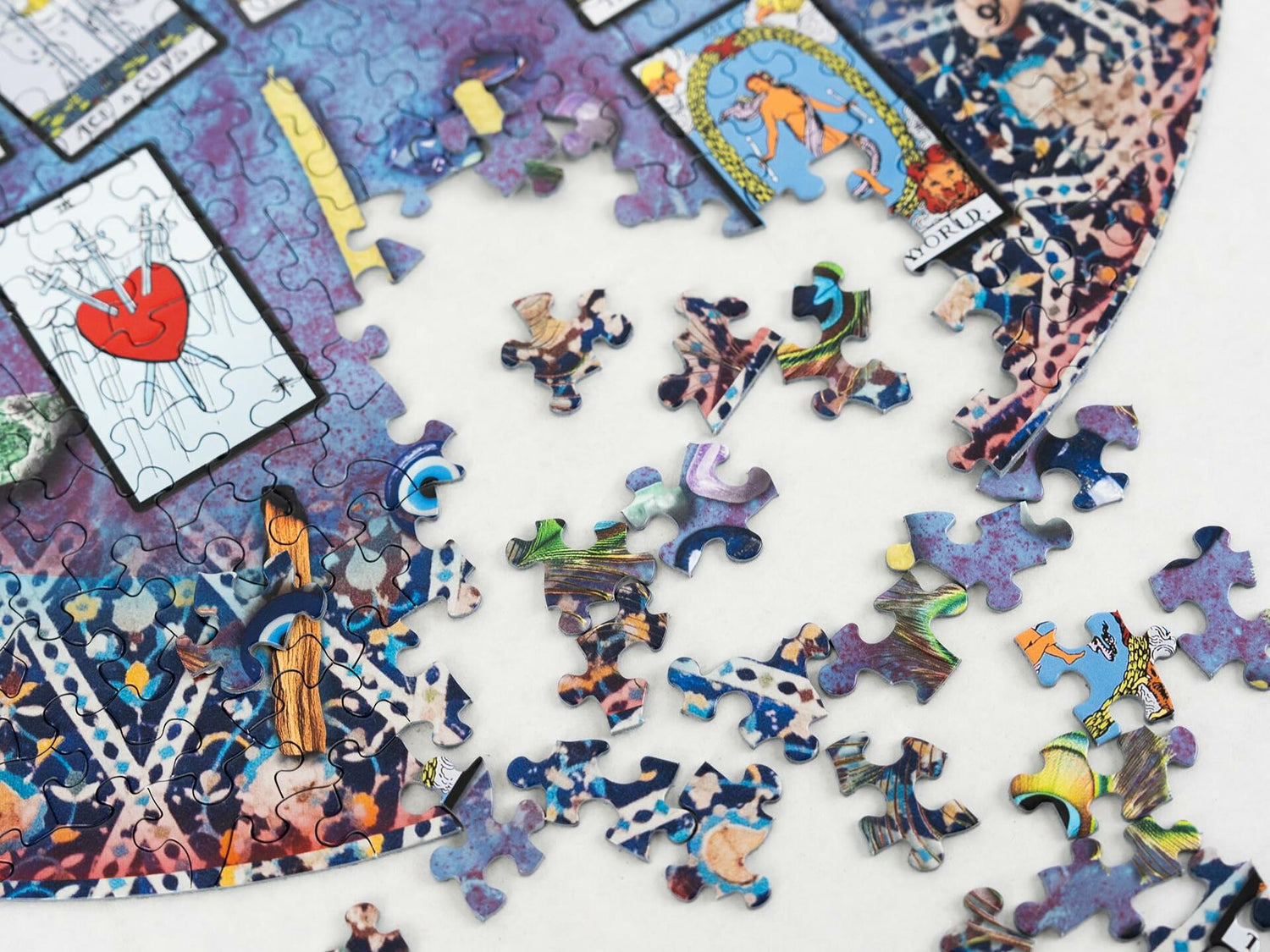 - Immerse yourself in the world of divination with this captivating mystical tarot reading 500 piece round puzzle, featuring an enchanting circular spread of tarot cards, healing crystals, candles, and spiritual charms set on a rich, celestial tapestry. This detailed, vibrant scene invites you to explore symbols of intuition, magic, and cosmic energy. Perfect for tarot enthusiasts, spiritual seekers, and anyone who loves bohemian and metaphysical art, this puzzle offers a truly magical and meditative experience.